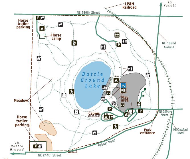 Click the icon for directions in google.From I-5 northbound or southbound: Take exit #11 and drive east to Battle Ground. On the east end of town, turn left on N.E. Grace Ave. (just in front of a Foodliner Grocery). Follow the signs to the park, approximately three miles from the city of Battle Ground.