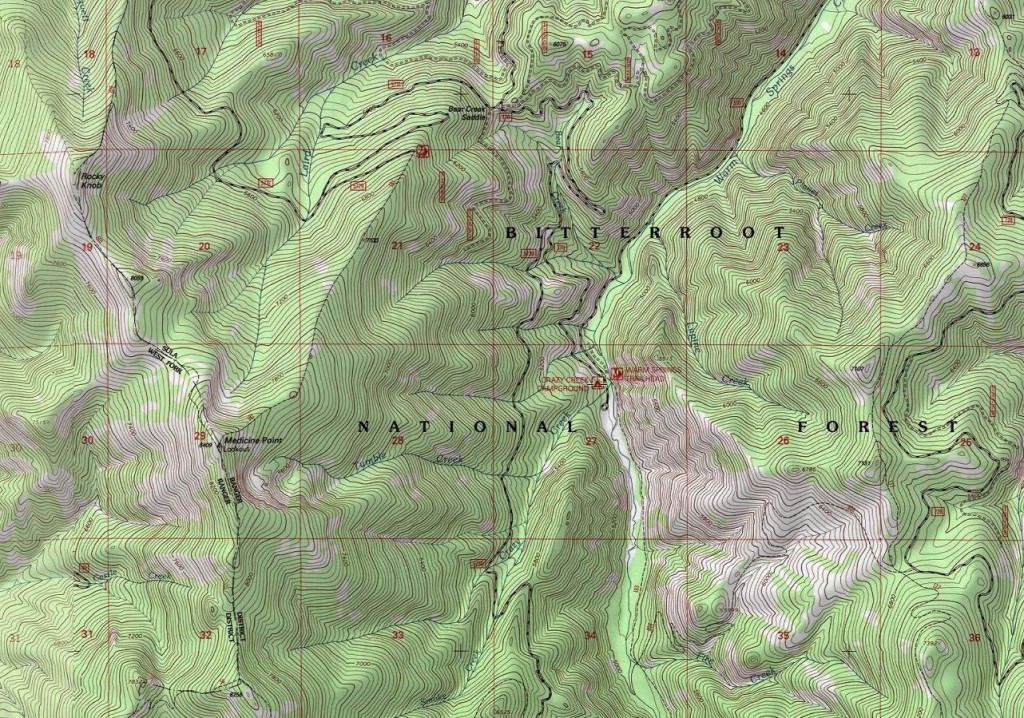 Crazy Creek Camp offer horse and mule riders a small, quite, camp along the banks of Crazy Creek. The main trail here runs south into the Bitterroots.