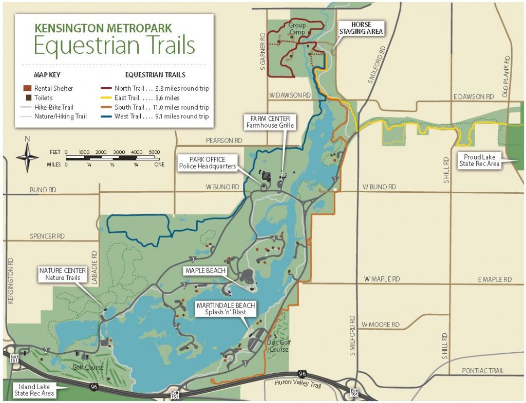 The 19 miles of horse and mule trails at Kensington Metro Park are well marked and offer riding for all ability levels.