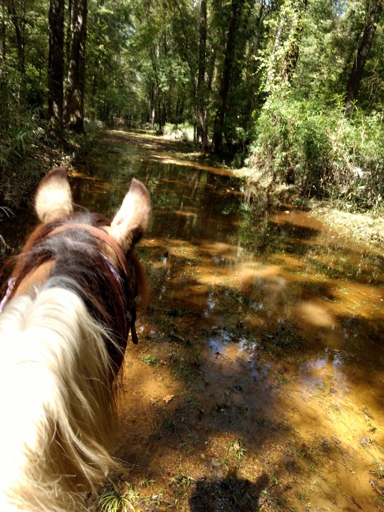 Lee State Park trails are wide and well maintained. Footing is good with hard packed sand, minimal gravel on the River Loop trail. Barefoot horses will not have any problem.